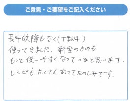 ふるさと納税で頂きました。塩麹やヨーグルトやサラダチキンを炊飯器で作っていたので、主にその代用品です。納豆も作りたいと思っていたのですが、豆の調理は他で必要な事がわかりましたので難しいとは思いますが、この手順も一緒に出来るといいのにと個人的には思いました。チーズ類が予想以上に色々調理出来そうですし、他のメニュー(主に味噌など)もとても楽しみです。レシピブックはとても見やすいので大変嬉しいです。欲を言えばデジタルでレシピをダウンロード出来ると、スマホなどでもさっと確認がで出来て手間が省けるので助かるかなとは思いました。これからの日々の使用が楽しみです。30代 男性