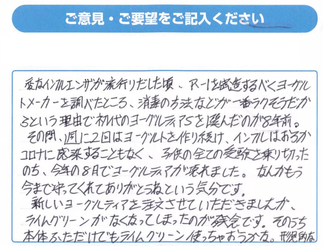 実際にヨーグルティアSやABCT種菌をご利用いただいたお客様から感想を掲載しております。