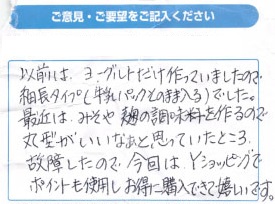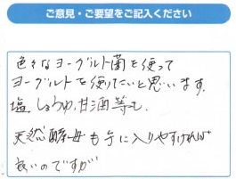 市販のヨーグルトと牛乳でたくさんのヨーグルトが出来るという事で、とても楽しみです!愛犬の健康がとても気になり、犬でも食べれるヨーグルトや甘酒を作りたいです!また、愛犬用の食事のレシピがあるともっともっと売れると思います。30代 女性
