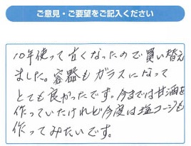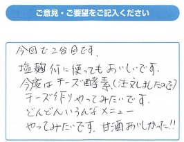 タニカさんのヨーグルトメーカーを購入してから毎日楽に塩麹など作れてすごく有難いです。色々なレシピも載せてくださってるので助かります。ただその通りの温度時間でも上手く出来ない事があるので、自分流で勝手に時間を伸ばしたりしてます。30代 女性