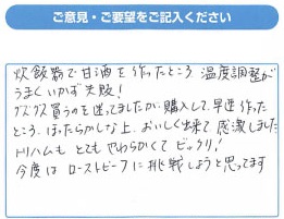 塩麹、醤油麹等作るのに購入しました。お料理教室の先生のおすすめでした。これからいっぱい作りたいと思います。温度調整が細かく出来る所やガラスも臭い移りがしないのが良いですね。50代 女性