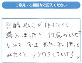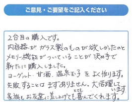 麹を使った料理に興味を持ち、ヨーグルトメーカーを探していたところタニカ様のヨーグルトメーカーに出会いました。まずはヨーグルトを作ってみました。ワクワクとウキウキで出来上がりが楽しみです。レンジでの消毒が本当にこれでいいのか?と不安ではありますが、とにかくやってみてます。みなさんの口コミを見て、何年もご使用されているのも確認しているので、私もこれから先何年も大切に使わせて頂きます。これから先の相棒になってくれるのが楽しみです。50代 女性