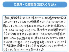 ヨーグルトを二人で頂いていますので3日に一度はメーカーの活躍があります。甘酒も作ってみました。簡単、美味しい。今度は塩麹、醤油麹、玉ねぎ麹などに挑戦しようと思っています。まだまだガラス容器が必要になりそうです。40代 女性