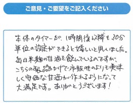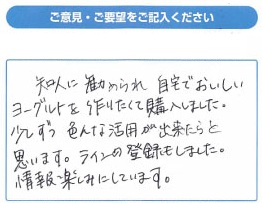 ヨーグルト、温泉玉子等よく作って食べます。ギリシャヨーグルトが好きでいつも一人で食べてしまってます。次は醤油麹、甘酒を作ってみようと思います。良い商品を有難うございます。30代 女性