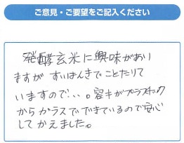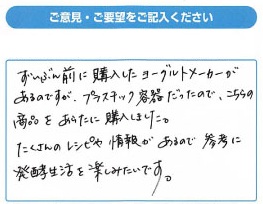 以前のプラスチックタイプから、御社のヨーグルトメーカーのファンです。今回、ガラスタイプを購入。ますます便利に、そしてバラエティ豊かに使用させて頂いています。60代 女性
